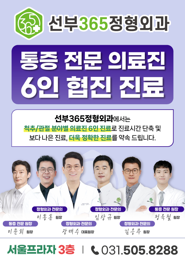 선부365정형외과에서는 척추/관절분야 의료진 5인 진료로 진료시간 단축 및 보다 나은 진료, 더욱 정확한 지료를 약속 드립니다.